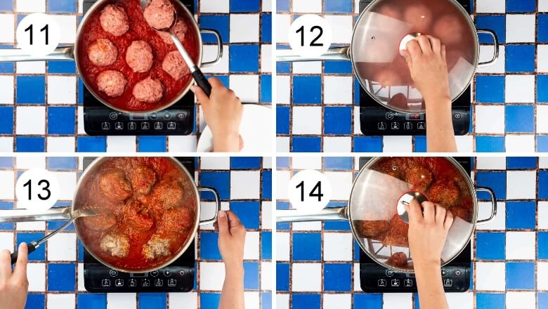 Nachdem die Sauce 20 Minuten geköchelt hat, die Fleischbällchen vorsichtig hineingeben und den Topf mit einem Deckel abdecken. Alles weitere 20 Minuten köcheln lassen.