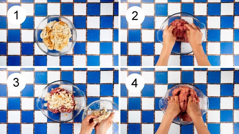 Jedes Hackfleisch verhält sich ein wenig anders: Manchmal ist es feuchter, manchmal fester. Deshalb ist die Menge des eingeweichten Brötchens flexibel.