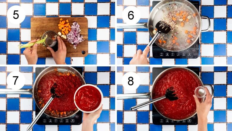 Erhitze danach das Olivenöl in einer großen Pfanne mit hohem Rand bei mittlerer Hitze. Gib den geriebenen Sellerie und die gewürfelte Zwiebel in die Pfanne und dünste sie weich. Anschließend zerdrückten Knoblauch und gehackte Karottenstücke hinzufügen und eine weitere Minute braten. Weißwein angießen und etwas einkochen lassen – die perfekte Gelegenheit Dir selbst ein Glas Weißwein zu gönnen.