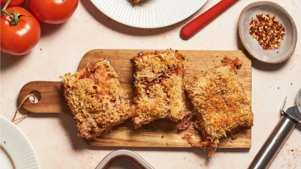 In große rechteckige Stücke schneiden, heiß servieren und genießen!