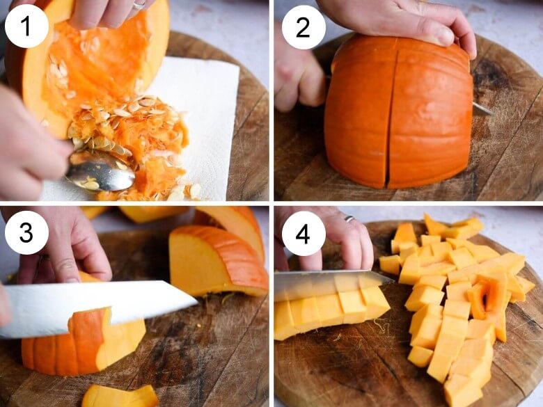 Den Kürbis in mittelgroße Würfel schneiden und mit den 3 Knoblauchzehen (mit Schale) auf ein großes Backblech geben.