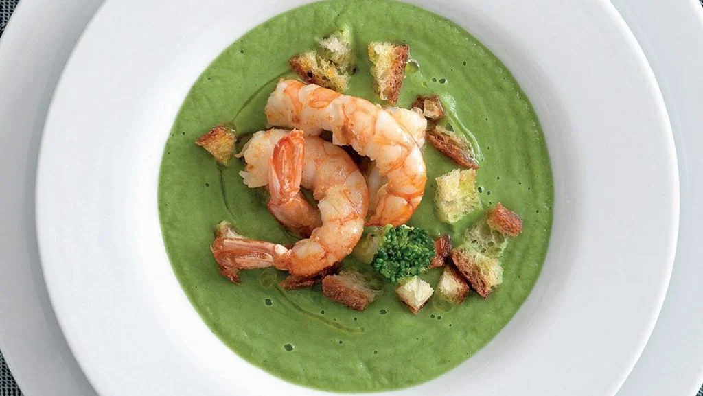 Brokkolicreme mit Garnelen: ein natürlicher erster Gang, reich an gesunden und unverfälschten Zutaten. Perfekt für kalte Winterabende!