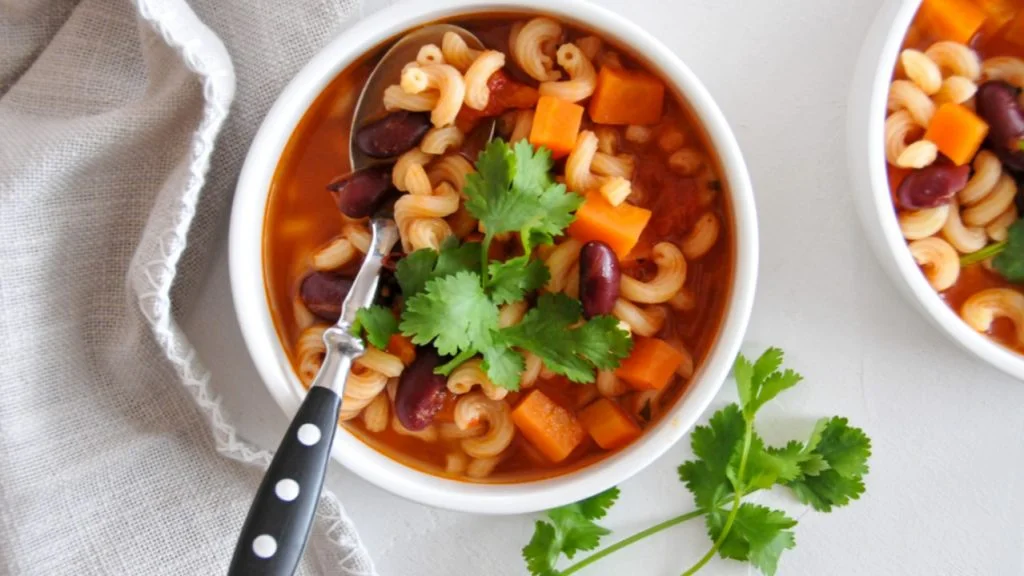 Die rote Minestrone wird mit Tomatenmark zubereitet, daher die Farbe. In eine Minestrone kommt eigentlich so alles was man in der Küche finden kann. Gemüse, Speck aber auch Bohnen und Pasta.
