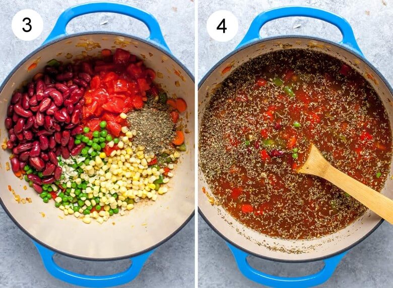 Als Nächstes Brühe und Gewürze hinzufügen und zum Kochen bringen. Die Brühe dabei immer wieder umrühren, damit sich alles gleichmäßig verteilt.