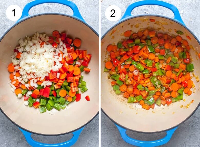 Zuerst das Gemüse, die Zwiebeln und den Knoblauch in Olivenöl anbraten, bis sie weich sind. Da dieses Rezept in 30 Minuten fertig ist, muss das Gemüse vor dem Hinzufügen der Brühe gar sein.