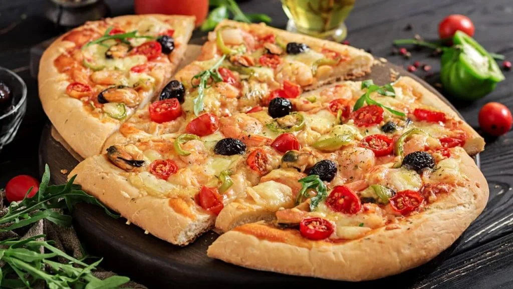 Pizza mit Meeresfrüchten – Pizza frutti di mare – Eine knusprige Pizza mit leckeren Krabben und Muscheln.