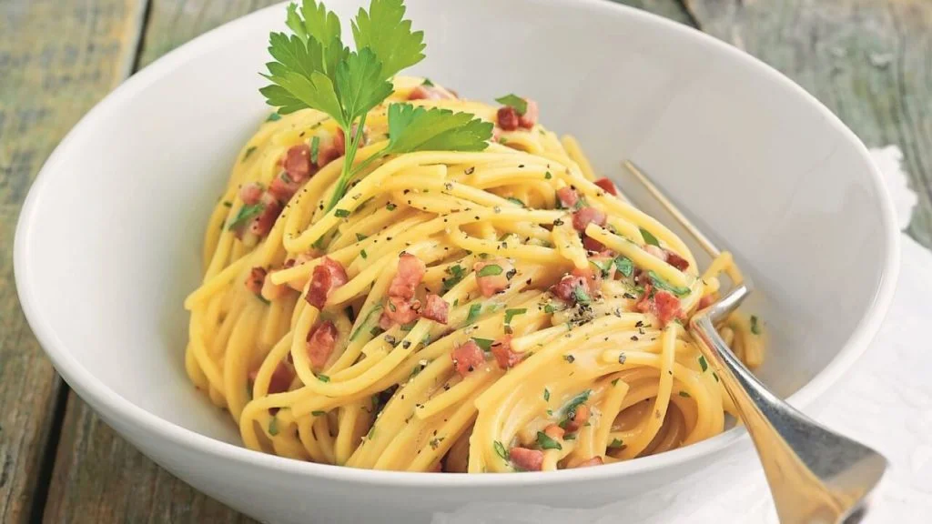 Spaghetti alla carbonara – ein Klassiker der Italienischen Küche direkt aus der Region Latium. Pasta mit Schinken und Speck.
